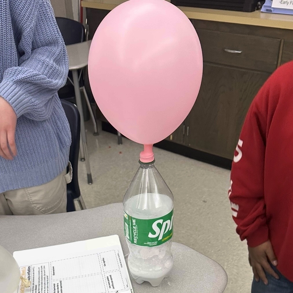 Students exploring how to make balloons inflate with a reaction between baking soda and vinegar during STEM Explorers.